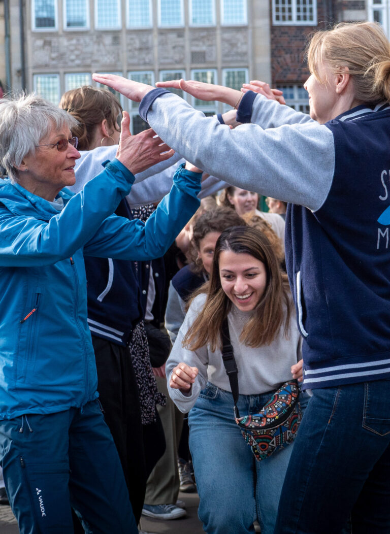Gedenken kann unterschiedliche Facetten haben. Der ‚Liberation Dance‘ wurde als eine Art des Gedenkens gewählt, da Tanz für Gemeinsamkeit, Rückhalt und ein Gefühl der Freiheit steht. Dabei regt die Choreographie zum Mitmachen an. Das an den Händen halten und Brücken bauen, was im Tanz zu erkennen ist, soll verbinden und ein Zeichen gegen das Erstarken rechter Tendenzen setzen. Für Jazzmusiker:innen und Swing-Tänzer:innen zur Zeit des Nationalsozialismus waren Musik und Tanz die einzigen Lichtblicke in einer Zeit der Ungewissheit und Verfolgung. So haben Swing-Jugendliche während der Zwangsarbeit im Konzentrationslager Jazzlieder gesungen und gespielt. Eines dieser Lieder war „Jeepers Creepers“ von Louis Armstrong, auf dessen Sound der ‚Liberation Dance‘ konzipiert wurde.